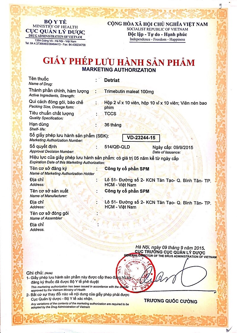 Detriat với thành phần chính Trimebutin maleat là chất chống co thắt có tác dụng chọn lọc trên cơ trơn và cơ vòng… được Cơ quan quản lý nhà nước cấp giấy xác nhận công bố lưu hành trên toàn quốc, Số: VD-23244-15