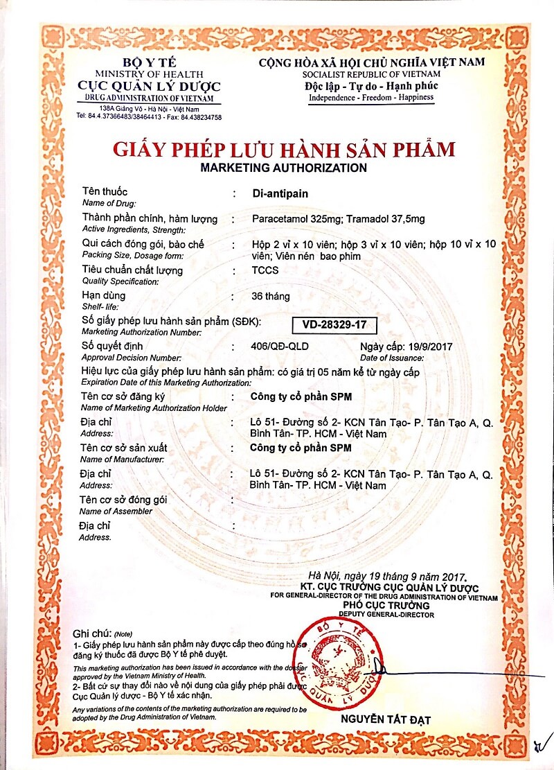Tác dụng Điều trị cơn đau từ trung bình đến nặng Di-Antipain (Viên nén bao phim) được Cơ quan quản lý nhà nước cấp giấy xác nhận công bố lưu hành trên toàn quốc, Số:VD- 5585-08