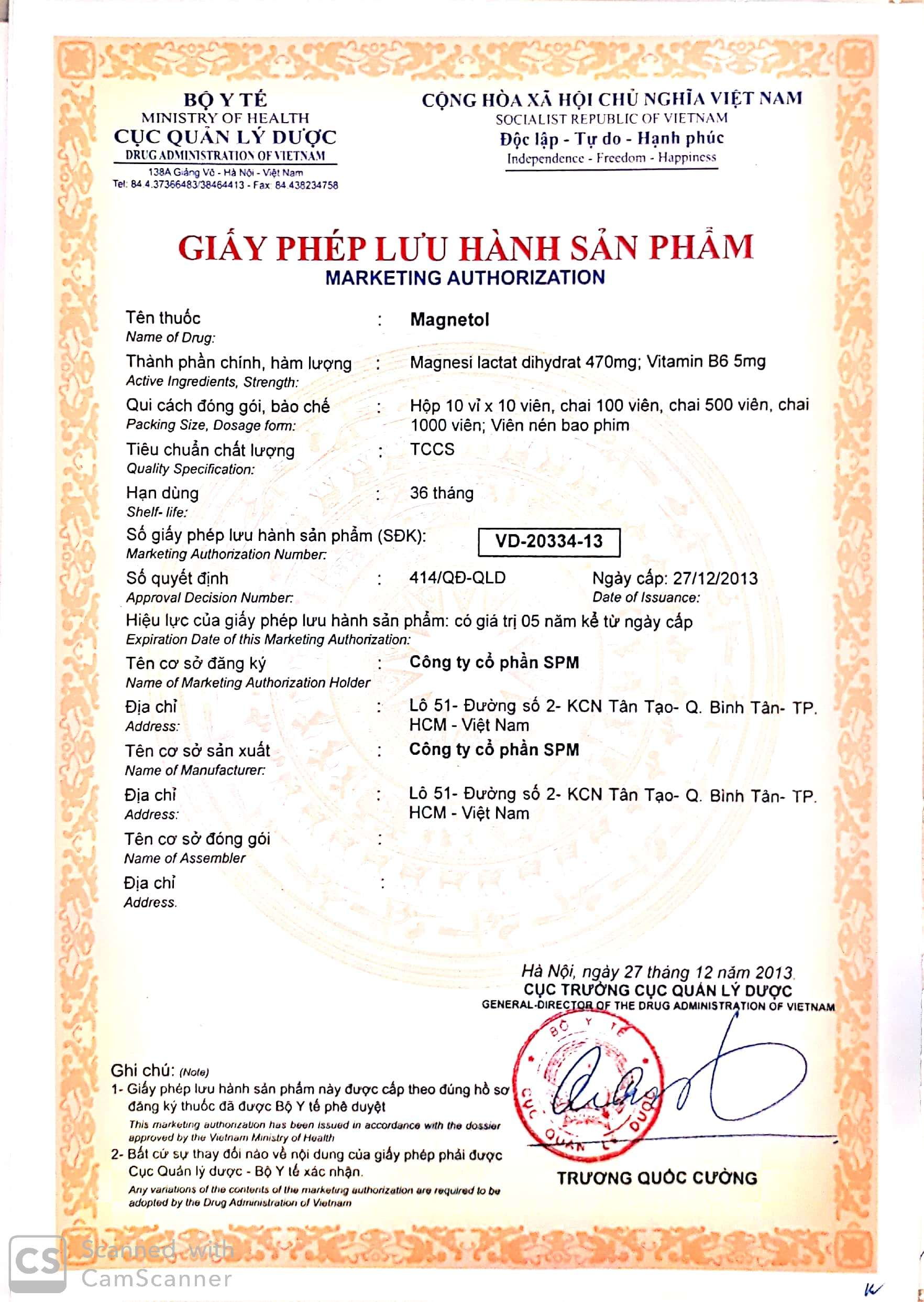 Magnetol có tác dụng hiệu quả trong điều trị các trường hợp thiếu magnesi nặng riêng biệt hay kết hợp, được Cơ quan quản lý nhà nước cấp giấy xác nhận công bố lưu hành trên toàn quốc, Số: VD-20334-13