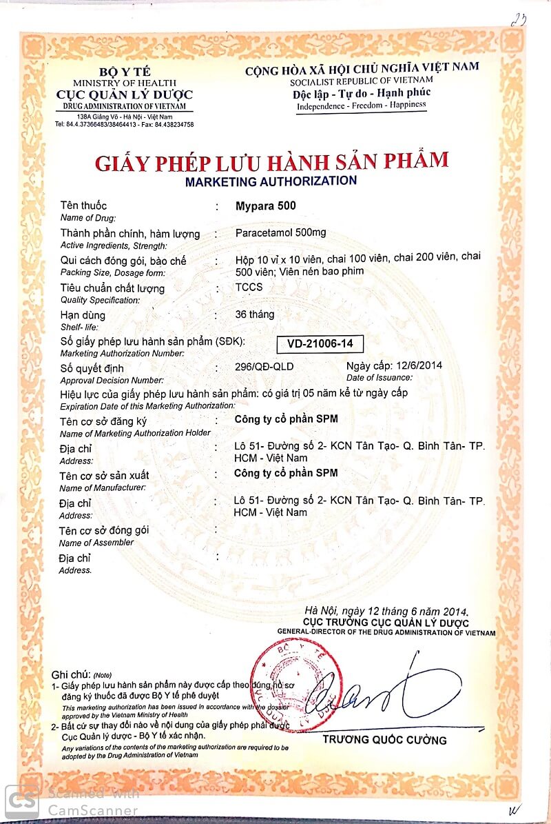 MyPara 500 điều trị các chứng đau và sốt nhẹ đến vừa.. được Cơ quan quản lý nhà nước cấp giấy xác nhận công bố lưu hành trên toàn quốc, Số: VD-21006-14