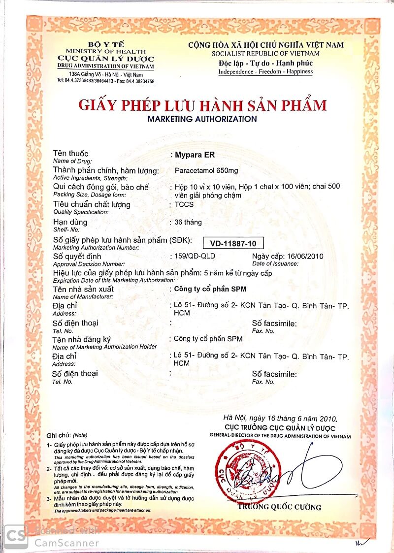 MyPara ER là thuốc giảm đau nhanh chứa paracetamol phóng thích chậm - tác dụng kéo dài được Cơ quan quản lý nhà nước cấp giấy xác nhận công bố lưu hành trên toàn quốc, Số: VD-11887-10