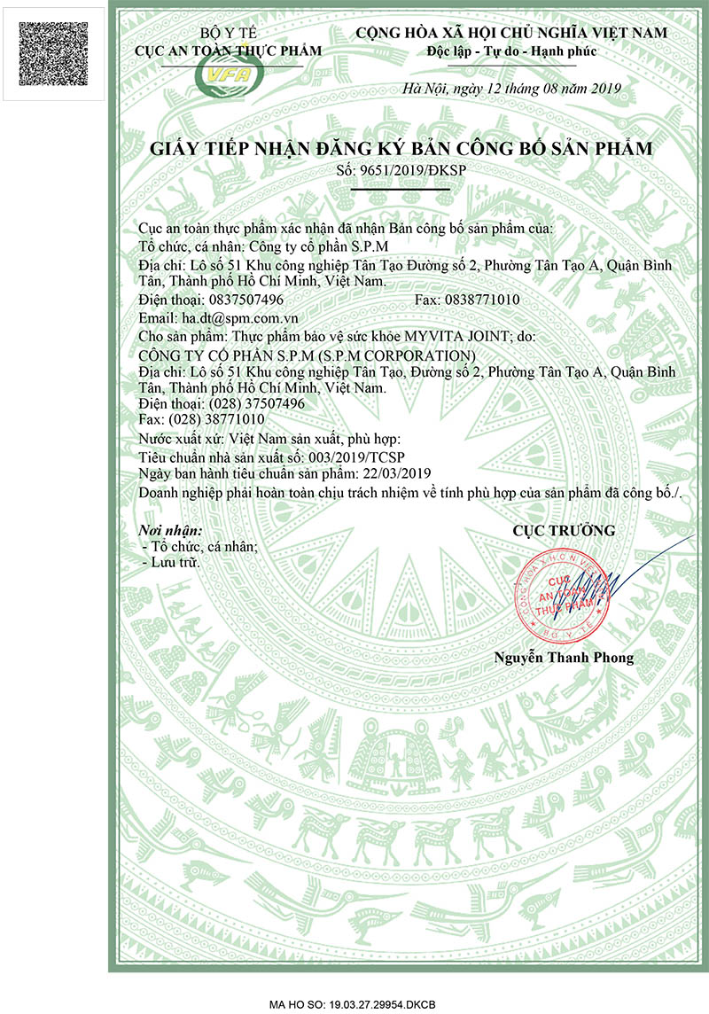 MyVita Joint giúp hồi phục và tái tạo mô sụn khớp, tăng tính linh hoạt vận động khớp, hỗ trợ liệu pháp điều trị thoái hóa khớp, đau nhức khớp được Cơ quan quản lý nhà nước cấp giấy xác nhận công bố lưu hành trên toàn quốc, Số: 9651/2019/ĐKSP, Số giấy phép quảng cáo: 01861/2019/ATTP-XNQC