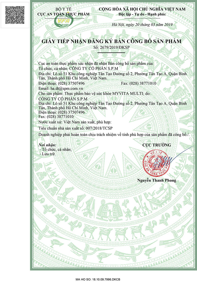 MyVita Multi đáp ứng các nhu cầu về vitamin và chất khoáng cho những bệnh nhân mới ốm dậy, sau phẫu thuật, trẻ em… được Cơ quan quản lý nhà nước cấp giấy xác nhận công bố lưu hành trên toàn quốc, Số: 2679/2019/ĐKSP, số giấy phép quảng cáo: 00778/2019/ATTP-XNQC