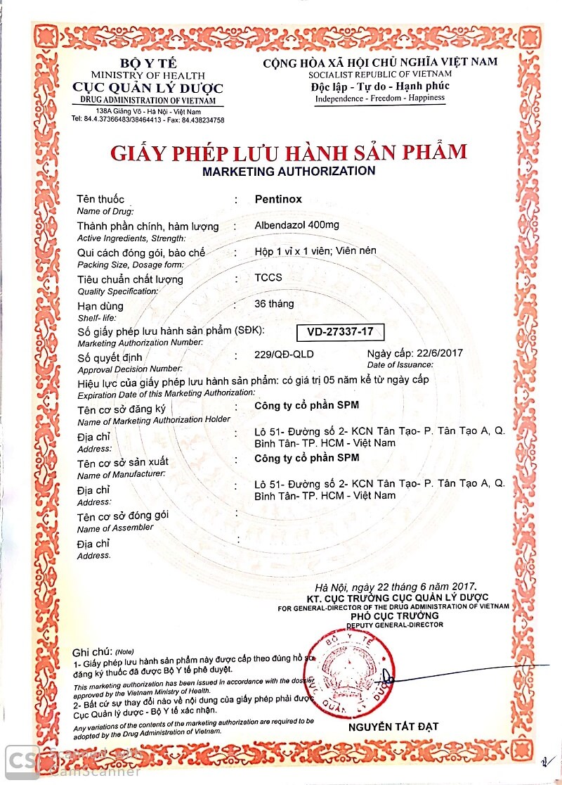 Pentinox điều trị giun, sán... Cơ quan quản lý nhà nước cấp giấy xác nhận công bố lưu hành trên toàn quốc, Số: VD-27337-17